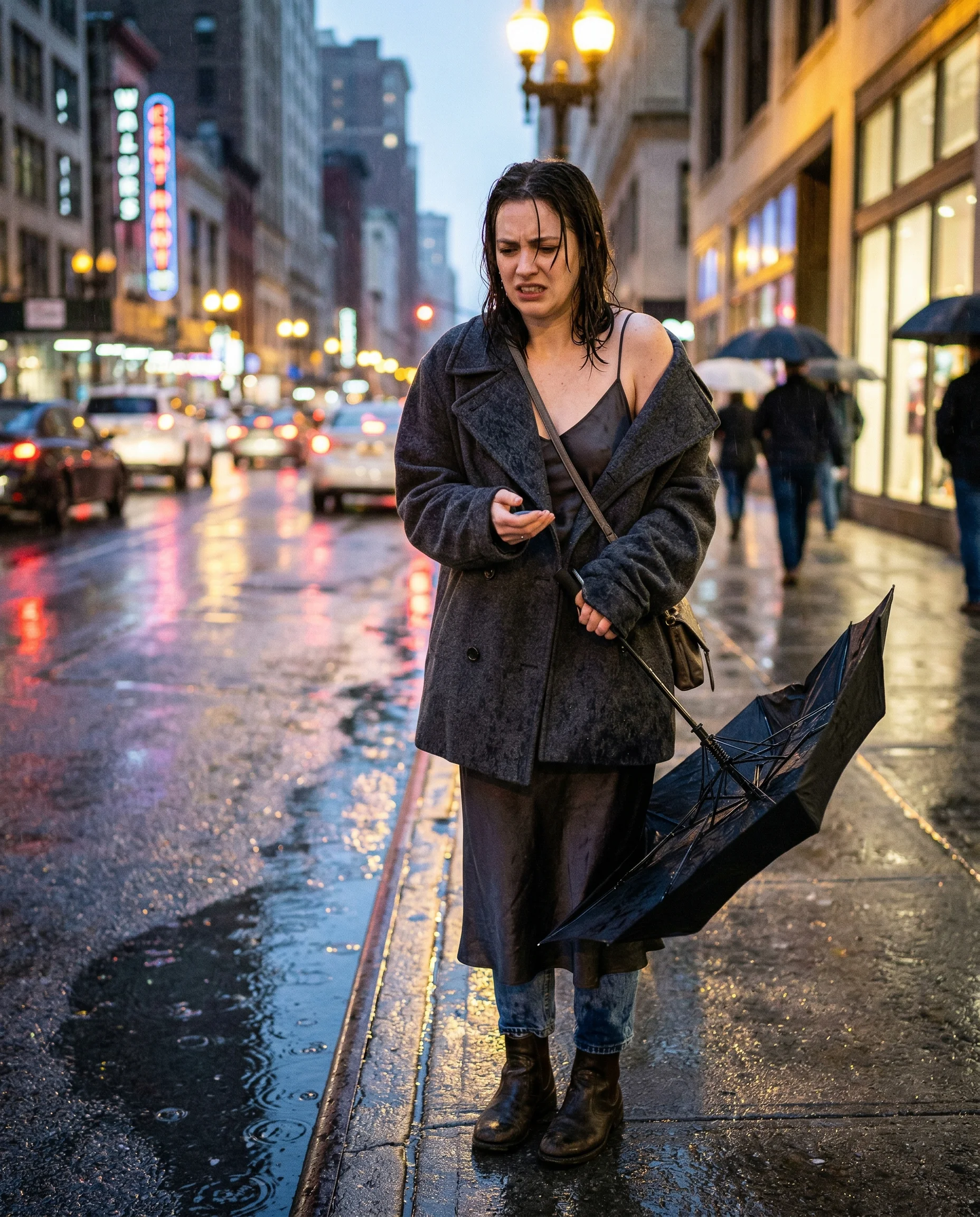 Nerves show up in the transition spaces. The coat-check struggle, a broken umbrella in the rain, or a hallway mirror check before the door even opens—these are the moments that hold the real weight. I want the coat still on at the table because the room is freezing or because the person is ready to bolt. The flash should feel a little rude, hitting the damp wool of a coat or the smudged bistro glass of a window. If the lighting is too soft, the tension evaporates and you are left with a generic portrait instead of a scene. I keep the camera low and the shutter fast, catching the awkwardness of a zipper that won’t cooperate or the specific, tired look of someone waiting on a curb.