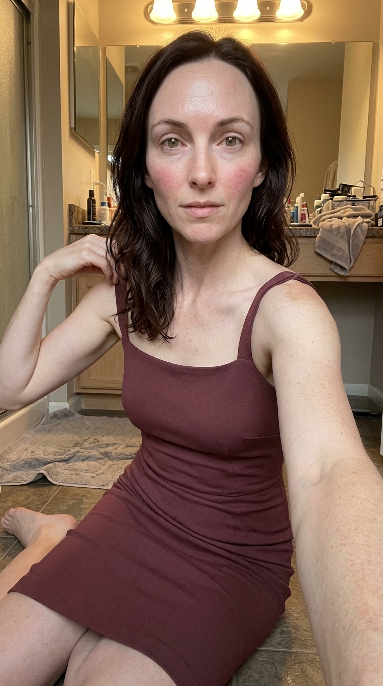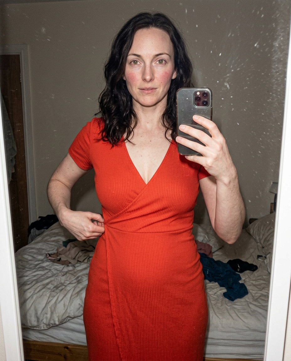 The key is visible fabric tension. When a dress fits closely, it should show small wrinkles, bunching at the waist, and seam stress where the body moves. Keeping these imperfections visible prevents the fabric from looking like a smooth, plastic overlay.