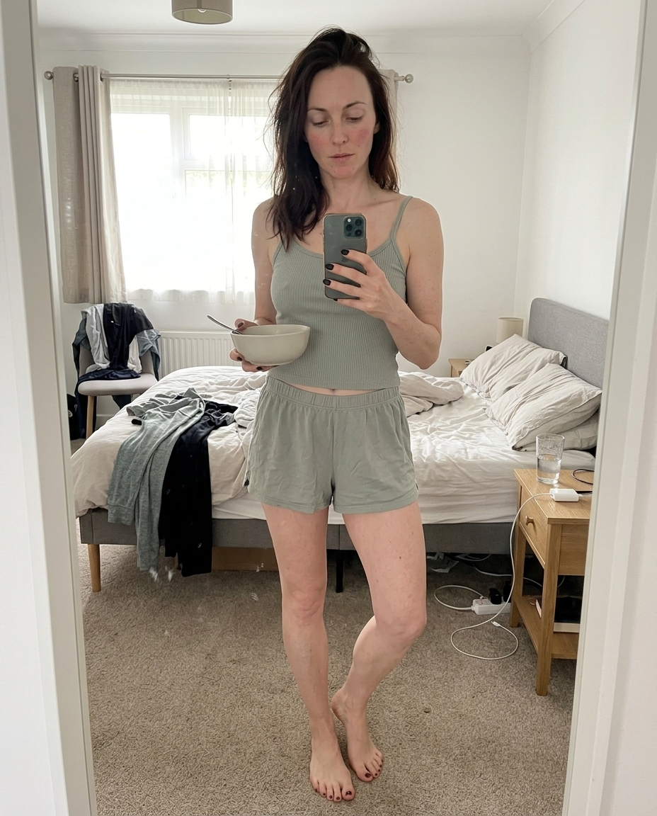 An open suitcase and a stray charger cable on the floor are the details that ground the frame. If the room were clean, the whole thing would feel like a showroom try-on. By leaving the bed unmade and the dresser clutter in the background, the image stops feeling like a performance and starts feeling like a quick check before heading out. It is the small, messy bits of reality that keep the flash from feeling too clinical.